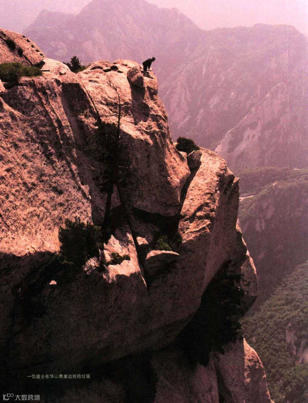 一位道士在华山悬崖边捡拾垃圾