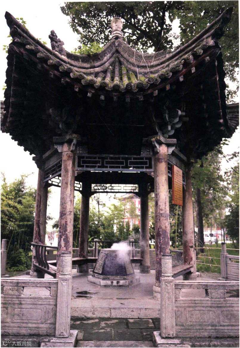 在比丘尼的指引下,我穿过一片幽幽的竹林,一条鹅卵石铺就的小道引着我来到一座不很显眼的六角形木质古亭下,因为年代久远,亭内的柱子已显得非常斑驳,而亭内正中正是那口著名的烟雾井。井台修得很高,呈六边形,目测井深有二十多米,但由于井口太小,井水是否清澈无从得知,但可以清晰地映出一个人的投影。