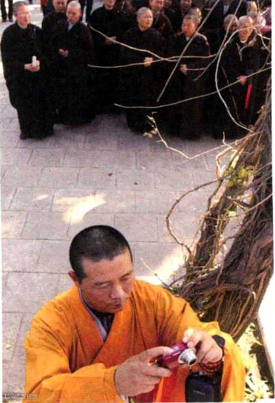 一位出家人在用相机拍摄法会