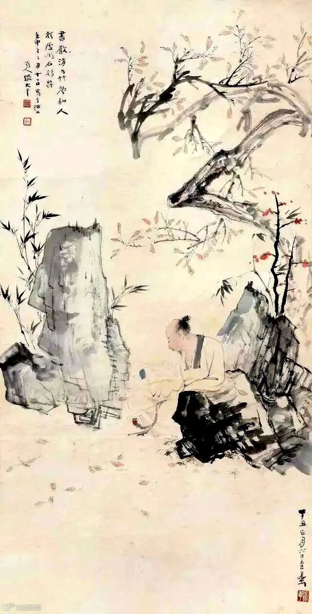 画中描绘了一位高士坐于石间悠然看书的场景,画中高士衣着魏晋服饰,衣饰宽大修长,发冠朝上,左臂依靠在坡石之上,右手托举着书,神态祥和地阅读思考,高士周围配置以山石和竹木花草,竹子墨色清幽,树叶颜色红润,为画面烘托了良好的读书气氛。