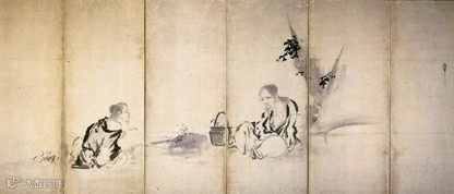在17世纪日本江户时代,“狩野派”绘画受中国绘画的影响很大,不但在画法上,而且在绘画题材上也常常用中国的典故和画题。中国的隐士和仙人是“狩野派”水墨画的重要主题。狩野探幽的弟弟狩野尚信画过一对六曲屏风,分别是《夷齐采薇》和《商山四皓》。我们不知道画家是否知道李唐所画的《采薇图》,但画中人的姿态颇有些相似处,同样是伯夷在右,叔齐在左。尤其是叔齐,侧身前倾,左手伸出,与李唐所画姿态十分相似。这幅画虽然是异时异地,但却能为我们重新思考李唐《采薇图》提供旁证。