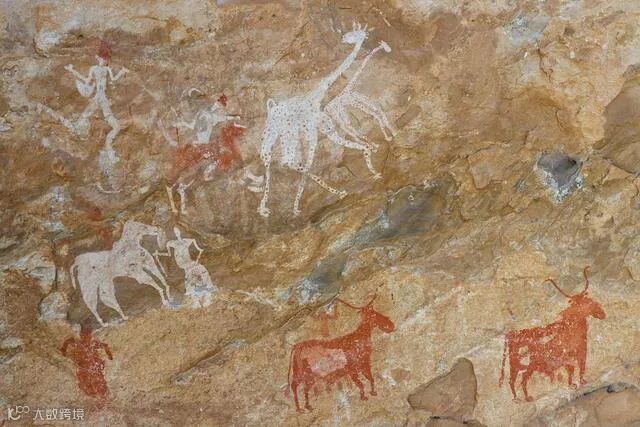 那么,在今天极端干燥的撒哈拉沙漠中,为什么会出现如此丰富多彩的古代艺术品呢?有些学者认为,要解开这个谜,就必须立足于考察非洲远古气候的变化。据考证,距今约3000~4000年前,撒哈拉不是沙漠而是湖泊和草原。约6000多年前,曾是高温和多雨期,多种植物在这里繁殖起来。只是到公元前200至公元300年左右,气候变异,昔日的大草原终于才变成沙漠。是谁在什么年代创造出这些硕大无比、气势磅礴的壁画群?刻制巨画又为了什么?