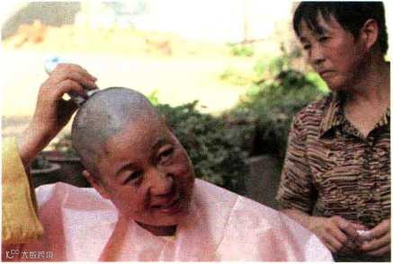 某日到访,她正在理发,一张方桌放于院中,围了一块淡粉披肩,手执“电推子”对镜理鬓,顷刻间短发委地,又“还原”为一个神清气爽的比丘尼。她是有故事的人,然而,纵云水千般,她一笑了之。她说:“小的时候,看到一本经书,突然觉得佛教的理论博大精深,值得一辈子去领悟,于是不顾家人的反对,先是吃素,后遁入佛门。”