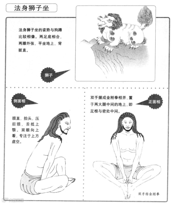 时间稍长后,继续以法身狮子坐式向上观,以报身象卧坐式横视,以化身仙人坐式向下视,则见清净界光内,法性所显具足五色光,且见光所显的圆动明点及明点所显幌动的金刚链。若未见法性明点,则须以两眼相等观察为要。见到以后,应引而斜视之。观察的轨则是于上如狮子纵视,平直如兔斜视,即如放箭直射而观,然后稍降于下,如象而观。晚上,用法身狮子坐式,观想肚脐内有四瓣红莲花,其上现(梵文阿)字若火炽燃。当暖气渐渐上升触及头顶上号(梵文杭)字,即降注白菩提,尤如加了油一样,于是火力增长,白菩提降到肚脐,即观想火猛烈燃烧,烧除一切习气病气,若觉极大安乐,则住于安乐之中,修空乐不二定。