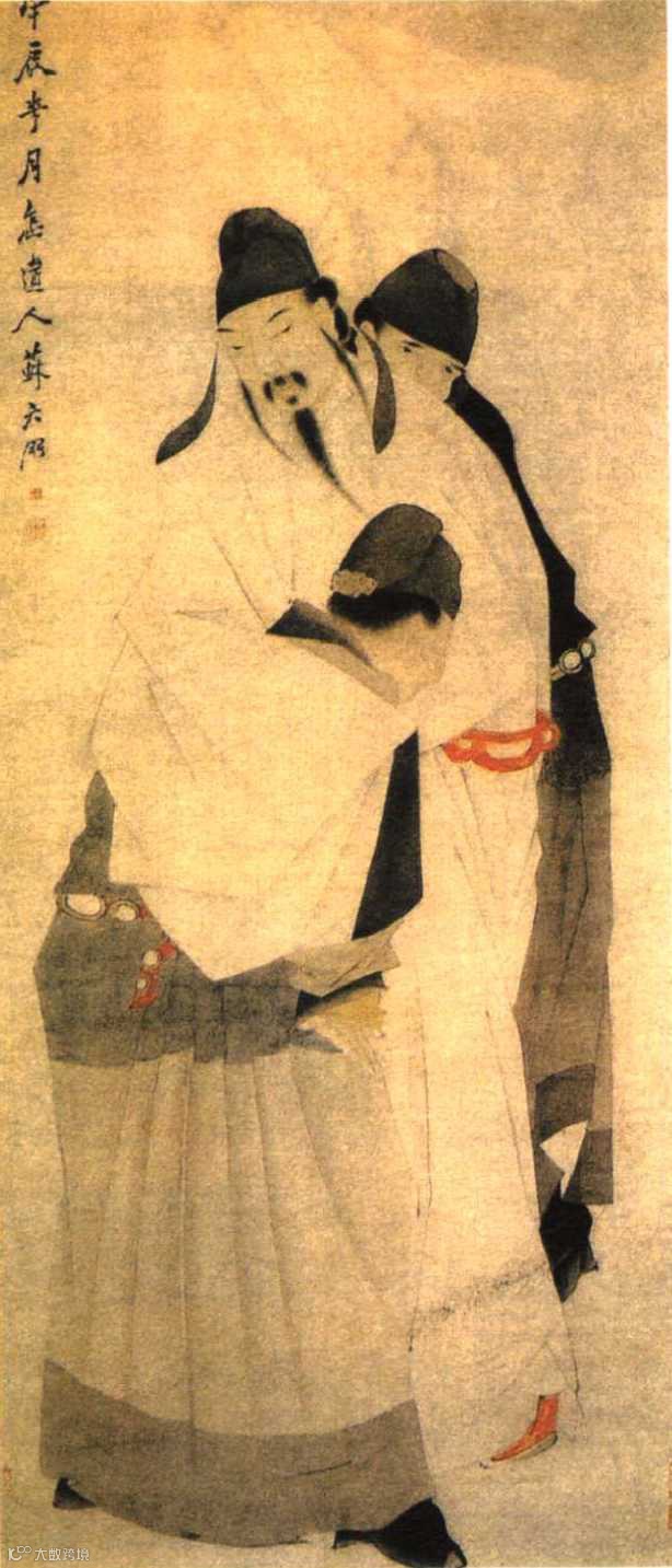 《太白醉酒图》 清 苏六朋 李白戴学士巾,眉宇间流露出高傲之色,对帮忙穿戴的内监侧目而视。