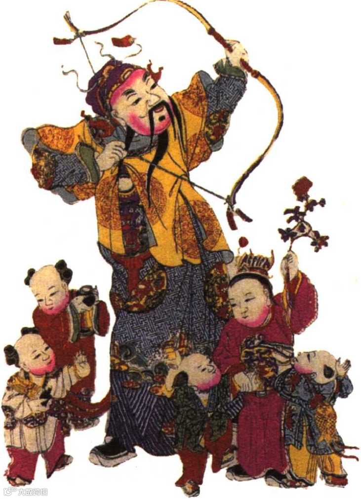 张仙面容慈样,张弓引箭射远方的天狗。一群儿童簇拥在他身边,充分体现了其儿童保护神的特点