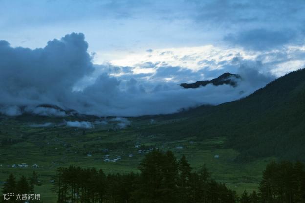 深深浅浅的绿叠加交融着,像波涛一样,起伏在山间,不甚齐整但具备幽深厚重的隐秘感。从浓荫掩映的山路上探出头,能看到山脚下的帕罗河谷,低矮的彩绘民房像积木一样,星罗棋布于河道两边,城镇在鲜绿的草甸上闪耀着干净漂亮的世俗光彩。河谷远处又是披盖着厚实绿毯的重重青山,雨雾缭绕,如流云游荡山间。