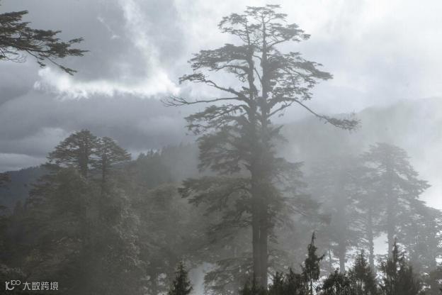不丹的森林按海拔大致分为三个部分:南部是浅山区,有茂密的长青阔叶林和肥沃的农田。北部则是高山牧场和冰川雪峰。海拔1500米到3500米之间为中部温带,首都廷布和大部分重要市镇、宗堡和寺庙都坐落在这片区域。雷龙小径就位于中部林木最为葱郁的部分,沿路有大量松柏科树木,林中覆满硕大的松果,淌着像蜜糖一样蜡黄黏稠的油脂。再往上走,是体态笔直、深入云天的冷杉,以及阔叶类橡木。到海拔 2000多米以上,是木兰、紫杉、桦木的地盘。更高一点,山终于从树海中探出头来,露出顶上青翠的草甸。草甸上除了高山繁花,还有一丛丛灌木点缀其上:马栗,胡桃,一丛丛无花的杜鹃……