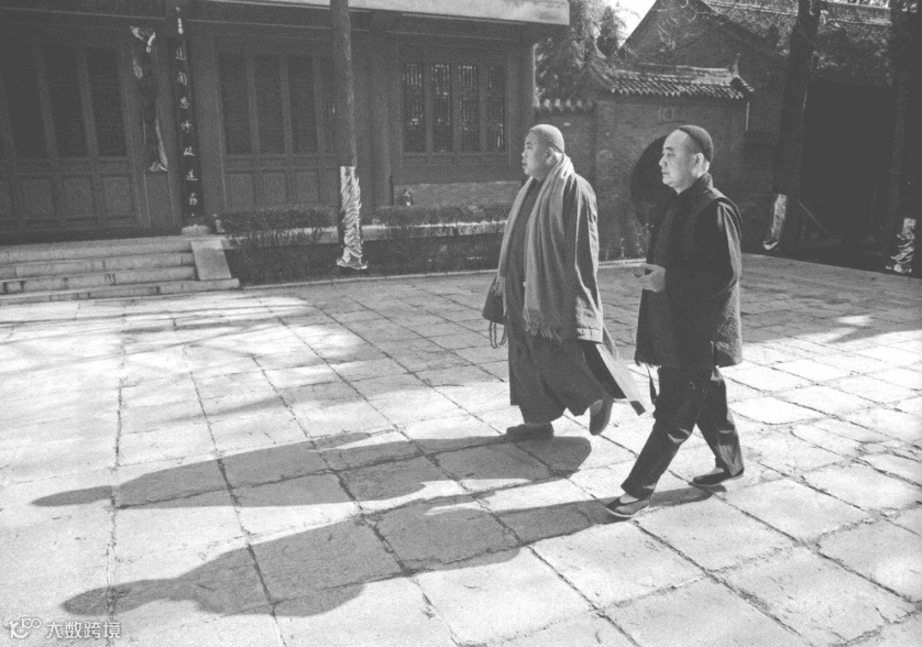 他一身黑色的中式服装,外面套着一件蓝色粗布背心,没有系扣子,胸前还搭着一条黑色的围巾,脚上穿着一双圆口布鞋,头戴羊毛针织的半圆形小帽,护着脑门。走起路来,步态轻盈,围巾和背心随着脚步移动而左右飘逸。我陪他一起回寺院。