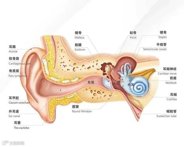 要说耳朵为什么会发出声音之前,我们得先了解一下耳朵为什么能够听到声音。耳朵的结构分为三个部分:外耳(outer ear)、中耳(middle ear)、内耳(inner ear)。当声音以“空气分子振动”的形式进入我们的耳朵后,会先通过外耳的“听管” 达到鼓膜,引起“鼓膜”的振动。然后,在中耳,会有三块“听小骨”,它们会组成一个活塞,把鼓膜的振动传送到内耳。在“内耳”中,我们有两套系统:一套是以“耳蜗”为代表的“听觉系统”,还有一套是以“半规管”为主的“平衡系统”。