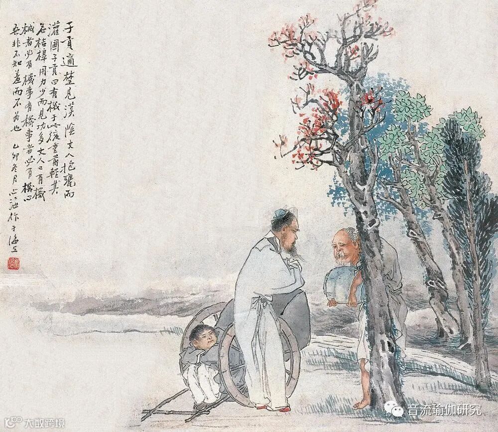 子贡是孔子早期的学生,毕业后经商,成了大富翁。他资助孔子办学,也到校讲讲课。有一次他带着几个学生自费旅游,从山东的鲁国起程,到山西的晋国,再到南方的楚国。观山玩水之外,沿途演说,宣传儒家,顺便摸摸商业行情。游了楚国,北返晋国路上,渡汉水,憩北岸的汉阴城外,路旁大树卞,见老大爷正在灌菜园,累得喘气。