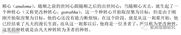 注(6) 道心路过程(Maggathought process):巴利文是(Magga-vTthi)。描述在道智出现前之特 殊速行心现象。
