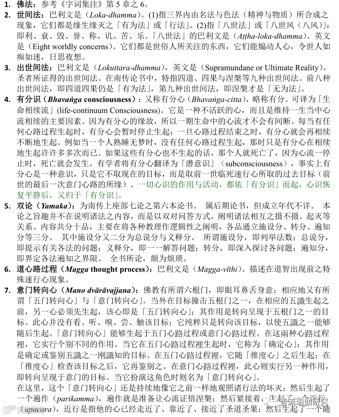 注(7) 意门转向心(Ma«odvaravajjana^)i佛教有所谓六根门,即眼耳鼻舌身意;相应地又有所谓「五门转向心」与「意门转向心」。当外在目标撞击五根门之一,在相应的五识生起之 前,另一心必须先生起,该心即是「五门转向心」;其作用是转向呈现于五根门之一的目 标。此心并没有看、听、嗅、尝、触该目标;它纯粹只是转向该目标,以使五识之一能够 随后生起。「意门转向心」能够生起于五门心路过程或意门心路过程。在这两种心路过程 里,它实行个别不同的作用。当它在五门心路过程里生起时,它称为「确定心」;其作用 是确定或鉴别五识之一刚识知的目标。在五门心路过程里,它随「推度心」之后生起;在 「推度心」检查该目标之后,它再鉴别之。在意门心路过程里,此心则实行另一种作用, 即转向呈现于意门的目标。当它扮演这角色时则名为「意门转向心」。