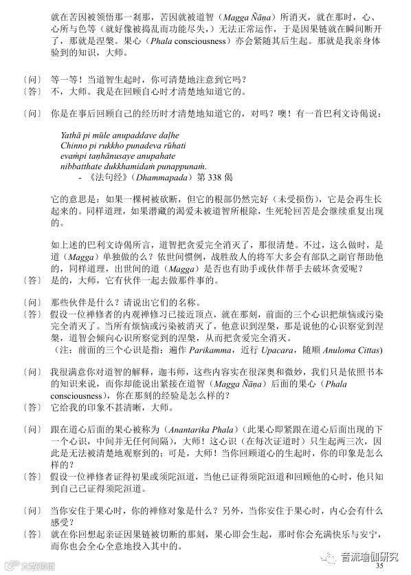 〔问〕跟在道心后面的果心被称为(Ananarika Pha/a)(此果心即紧跟在道心后面出现的下 一个心识,中间并无任何间隔),大师!这心识(在每次证道时)只生起两三次,因 此是无法被清楚地观察到的;可是,大师!当你回顾道心的生起时,你的印象是怎么 样的?