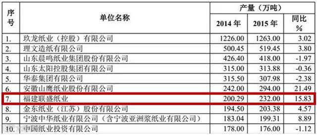 据中国造纸协会5月10日发布的《中国造纸工业2015年度报告》可以看出,联盛纸业2015年造纸产量为232万吨,较上年增长15.83%,目前全国排名第七位。