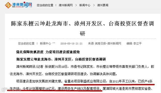 报道中指出,重点项目联盛纸业有限公司自2011年开工以来,已投产4条生产线,今年计划再增资18亿元,建设两条生产线以及配套项目。