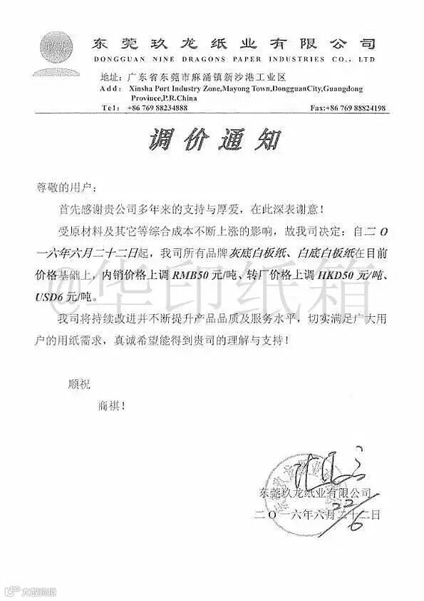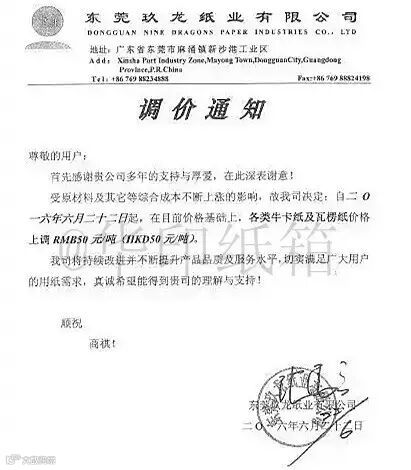 6月22日,东莞玖龙发出通知,受原材料及其它等综合成本不断上涨的影响,自即日起所有各类牛卡纸及瓦楞纸价格上调50元/吨。