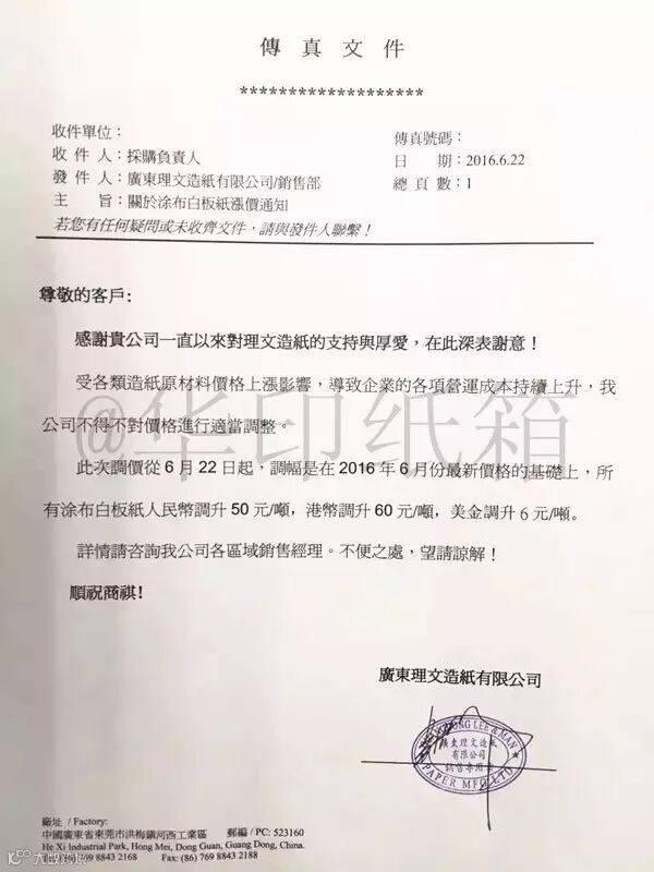 6月22日,广东理文发出通知,受各类造纸原材料价格上涨影响,导致企业的各项营运成本持续上升,公司不得不对价格进行适当调整,自即日起所有涂布白板纸价格在6月最新价格基础上上调50元/吨。