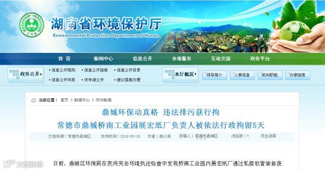 据悉,这起案件是自新《环保法》实施以来常德市鼎城区首例因违法排污而被行政拘留的案件。