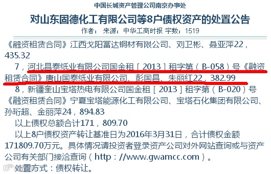 据报道,中国长城资产管理公司南京办事处拟对从国银金融租赁股份有限公司收购的对河北昌泰纸业有限公司债权资产进行公开处置: