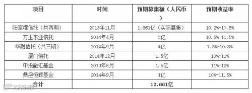 从2013年以来,国昌天宇旗下的昌泰纸业从多家信托公司及基金公司融资,用途或用于补充流动资金或用于购买原材料,募集额度都在1亿元以上,项目周期多在24个月以内,而信托或基金公司对投资人公布的预期收益率则基本在10%左右。见下表。