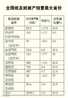 至2015年年底,广东省造纸业规模以上企业206家,全年平均用工人数达22.2万人,机制纸及纸板产量达2078.3万吨,同比增长4.3%,跃居全国第一位,成为全国纸及纸板产销量最大的省份。