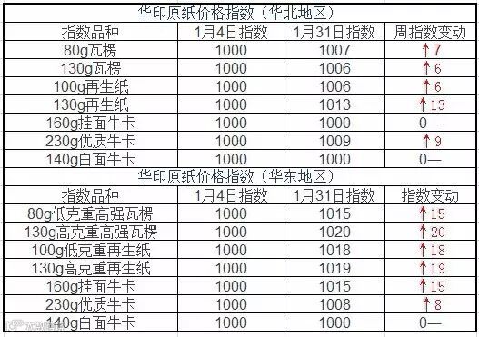 而华东地区受规模纸厂在2015年12月受限产停产影响,纸厂普遍库存较低,纸箱厂拿货积极且1月生意普遍较好,春节备货订单相对集中,纸厂出货持续顺畅。月初太仓玖龙、江苏理文以及吉安纸容器涨价落实较为坚决,基本提涨50元/吨,导致本月瓦楞纸、再生纸及优质牛卡纸、挂面牛卡纸价格指数普遍上调,其中130g高瓦指数上涨20点。