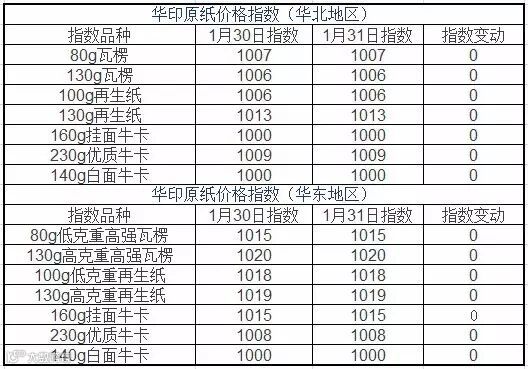 1月华北地区仅有2个纸种价格维持不变,一个是160g挂面牛卡纸,一个是140g白面牛卡纸。而华东地区只有140g白面牛卡纸价格维持不变。