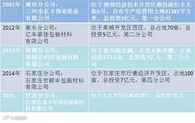 亿丰伟业集团官网显示,2001年9月公司组建,以新型高强度复合包装材料的研发、生产及销售为主,注册资金5000万,下设九个中心及各分公司十大机构,拥有1000名员工。2013年12月6日,亿丰伟业集团宣布成立。