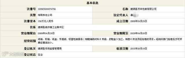 据查,江苏建湖县双丰包装有限公司成立于2009年4月29日,坐落于高作镇工业集中区,法定代表人为潘某余。公司注册资本150万元,主营纸箱、彩箱、纸盒、手提袋、吸塑包装等。
