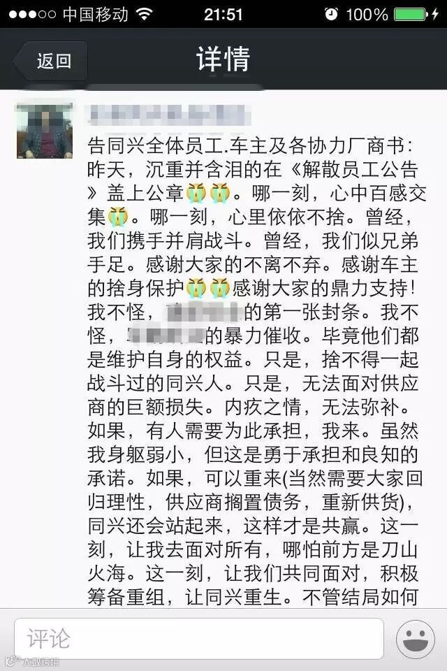 请社会各界人士积极建言献策,同时欢迎战略投资者加入,共同参与制定同兴重组方案,力争恢复同兴的经营,实现合作共赢!