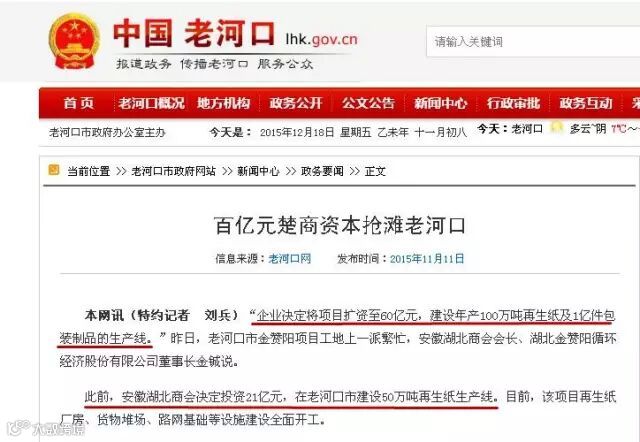 说点正事!2014年初,安徽湖北商会决定在湖北老河口建设一个年产50万吨再生纸项目,总投资21亿元,占地734亩,年生产再生纸50万吨,其中项目建设周期为24个月,项目建成后年可生产高强瓦楞原纸20万吨,牛皮箱板纸30万吨,年营业收入30亿元,年创税收5000万元,安置就业680人,是鄂豫川陕地区最大工业造纸项目之一。