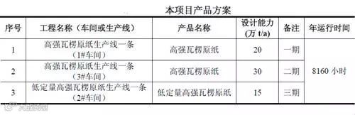 分三期建设:一期年产20万吨高瓦纸,二期年产30万吨高瓦纸,三期年产15万吨低定量高瓦纸
