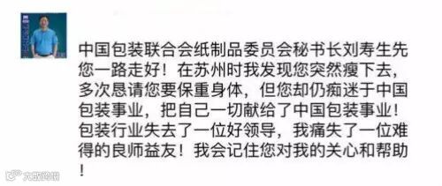 刘寿生秘书长去世前一天仍在为纸包装行业奔波工作,他的离世令人震惊的同时更令人惋惜和沉痛,实乃纸包装行业的巨大损失!