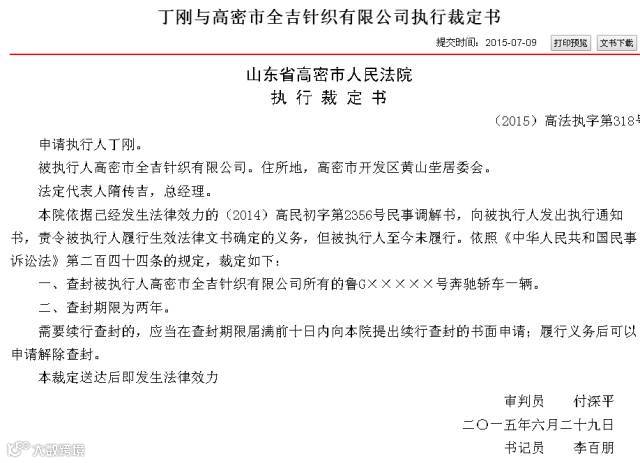 公开消息显示,早在2014年山东潍坊公布的失信被执行人名单中,山东全吉针织有限公司赫然在列。而中国法院文书网中关于该公司的诉讼案件一抓一大把,就在今年6月29日,山东全吉针织有限公司最后的一辆奔驰轿车都被法院查封!
