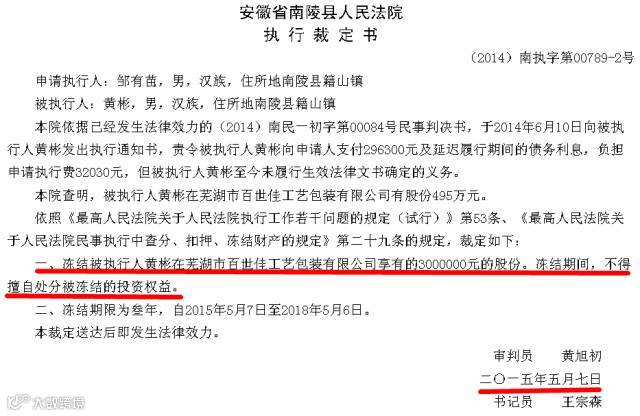 根据安徽省南陵县人民法院的判决公告,黄彬曾以芜湖市百世佳工艺包装有限公司为担保参与多项民间借贷,2015年7月28日法院裁定执行担保人芜湖市百世佳工艺包装有限公司的财产!事实上,早在今年5月7日,就因欠邹某民间借贷近30万无力偿还,黄彬在芜湖市百世佳工艺包装有限公司享有的300万元股份被冻结!