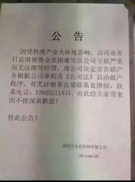 该公告称,公司因受传统产业大环境影响,公司业务日益滑坡,资金流困难导致公司亏损严重而无法继续经营,遂决定宣告破产并根据公司章程及《公司法》启动破产程序。