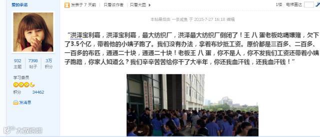 【正文】7月31日,据安徽经视频道《第一时间》栏目报道,安徽六安宝利嘉纺织工厂门遭上百工人围堵讨薪,据报道称该工厂已与25号停产放假,共拖欠上千员工2个月一千多万工资。随即该公司员工爆料,宝利嘉集团位于江苏洪泽、安徽六安、滁州的3个生产基地与7月25号同一天停工,老板欠下了3.5个亿已“跑路”。