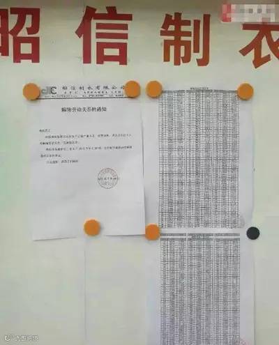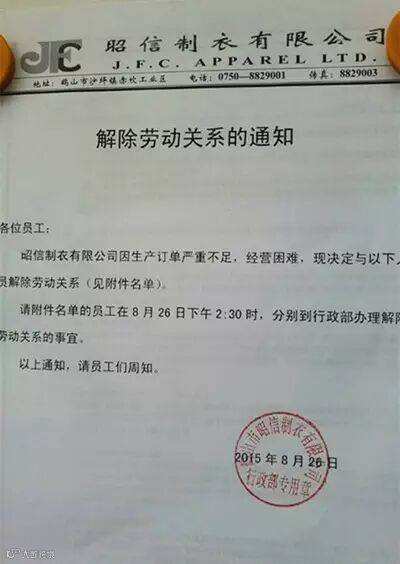 8月26日,广东省江门市鹤山赤坎昭信制衣厂一则“解除劳动关系的通知”在业内引发强烈轰动。《通知》称,“昭信制衣有限公司因生产订单严重不足,经营困难,现决定与以下人员解除劳动关系(见附件名单)。”