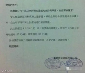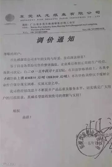【正文】最近两天,不少纸箱厂都收到玖龙纸业的一份文件——调价通知,该通知指出玖龙纸业将于4月15日起将各类牛卡纸价格上调50元/吨!