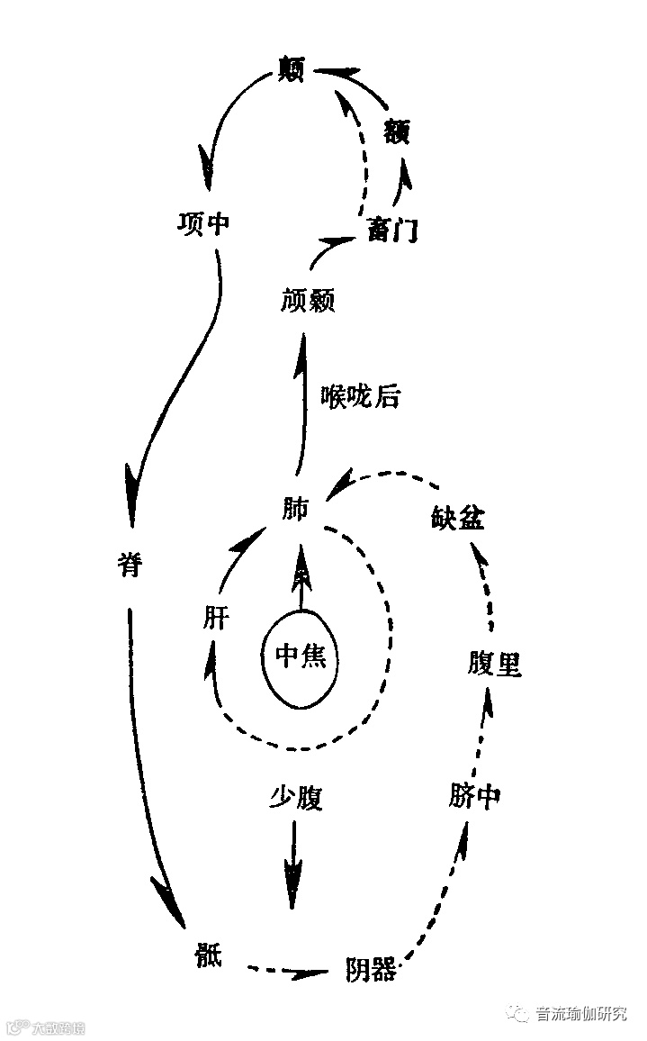 这些都同奇经八脉有关系。所谓奇经八脉,指独立于十二经脉以外的一个系统。普通所讲督脉都认为是背脊骨一直上来,从尾椎骨开始,一路上来到后脑这个地方。其实不止上到头顶,也从后面颈部转到脑内。所以上次提到过,同善社演变到现在的一贯道点窍,乃至很多的旁门左道守窍等等,它的基本理由是督脉的顶点在眉间这里。实际上是不是如此,在医学上还是个问题。离开医学,光讲气脉之学也是问题。所谓任脉就是从小腹开始,下来到男女的生殖部分会阴,一路上来则到咽喉。还有中间环腰的这个叫带脉,女性要特别注重的是带脉。