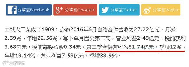 同时,荣成公布2016年6月自结合并营收为27.22亿元,月减2.39%、年增22.56%,写下单月历史第三高。营业利益2.48亿元,税前获利3.68亿元,税前每股盈余0.34元。
