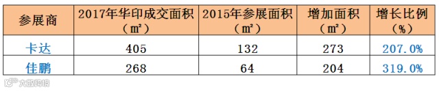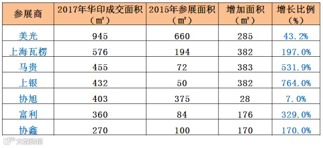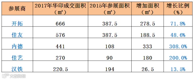 3、瓦线干部领军品牌青岛开拓、青岛佳友、上海内德、佳艺、汉铁参加华印智能展,展会面积合计2173.5平方米,较2015年的1167平米增长1006.5平米,增长86%,其中内德增长高达308%。