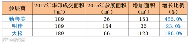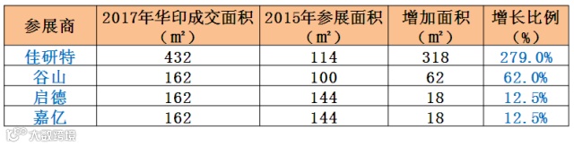 这57家签约设备商在2015年合计展位面积9154平米,2017年合计预定展位面积已超2.1万平米,占实际可展出面积的50%以上,增长率高达129%!57家签约设备商中98%的展位面积较2015年大幅增长,其中含国际知名品牌5家,台湾领先品牌5家。