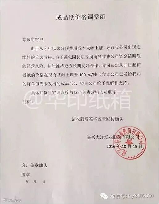 嘉兴大洋纸业:自10月15日起,价格上涨100元/吨