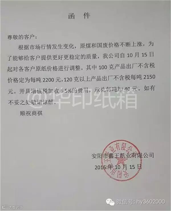 安阳市鑫王纸业:自10月15日起,调价基础上承兑每吨加40元