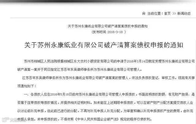 3月17日, 苏州市相城区人民法院根据相城区永大农村小额贷款有限公司的申请于2016年3月14日裁定受理苏州永康纸业有限公司破产清算,随后发布了关于苏州永康纸业有限公司破产清算案债权申报的通知。