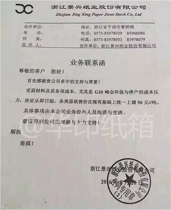 5月20日:浙江景兴发出业务联系函,宣传从即日起各类原纸售价在现有基础上统一上调50元/吨。提价的理由为受原材料及其各项成本,尤其是G20峰会环保与停产的成本压力。