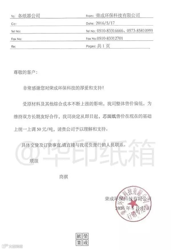 5月17日:荣成环保率先发出涨价函,宣布即日起芯面纸售价在原有基础上统一上调50元/吨。而此次提价的理由为受原材料及其他综合成本不断上涨影响。