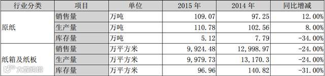 3、产品产销情况:2015年,景兴纸业原纸生产量达110.78万吨,销售量达109.07万吨;纸箱及纸板生产量9979.73万㎡,销售量达9924.48万㎡。